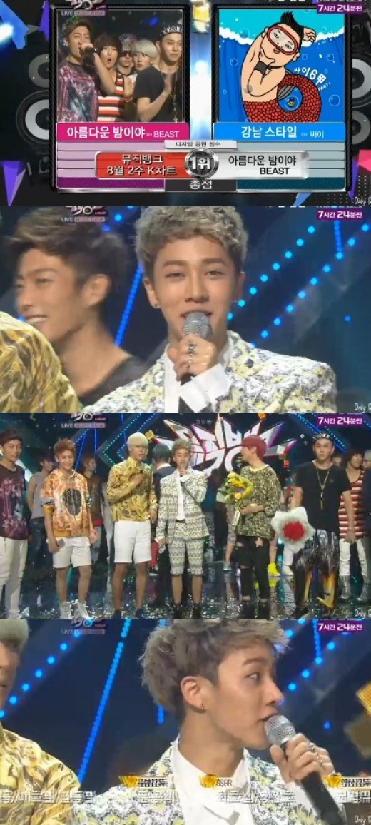ビーストは 10日午後油とイ・ジャンウの進行に生放送された 'ミュージックバンク'から '美しい夜だ'でサイと競争をした結果, 1位を引っつかんだ.