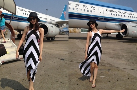 公開された写真の中にはイ・ダヘの黒い縞模様が刻まれた白いワンピースを着て飛行機の前に立ってポーズを取っている. 黒い帽子にサングラス, 百でおしゃれをした彼はとっくりみたいな体つきでセックシミを現わして人目を引く.
