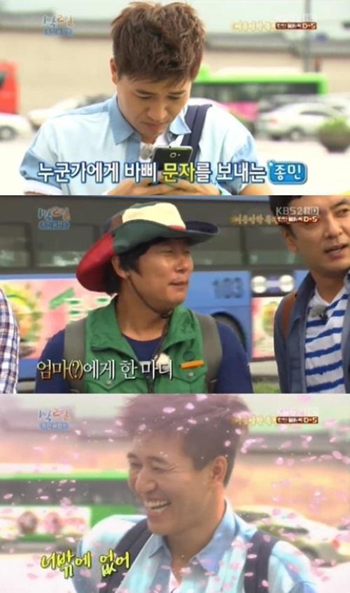 この日キム・ジョンミンは携帯電話で文字を密かに送ろうとしたがメンバーたちにばれた. この日 ‘1泊2日’ メンバーたちは特集の規則に従って製作陣に携帯電話を返らなければならなかった.