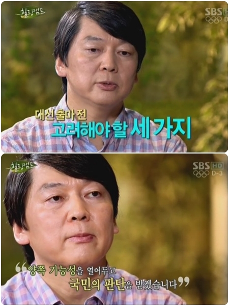 安哲秀院長は 23日午後 11時5分放送した SBS トークプログラム 'ヒーリングキャンプ, 嬉しくないか'に出演して大統領選挙出馬と係わった自分の考えを明らかにした.