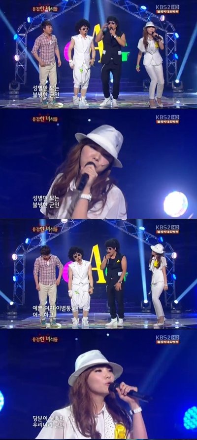 去る 29日放送された KBS 2TV ‘ギャグコンサート-勇ましいやつら’では軍入隊を控えた男に扮したヤングソンイルが女に茶人問題で勇ましいやつらメンバーたちに悩みの相談をした.